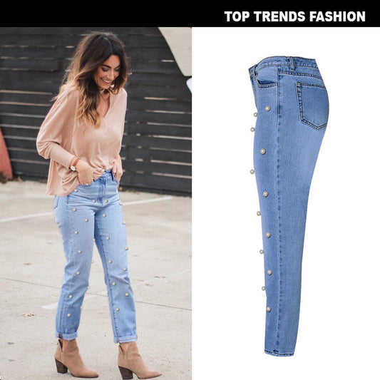 Pearl Studded Jeans - Washed Blue