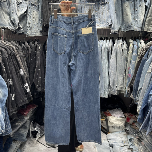 Embroidered Bow Loose Straight High Waist Waist Jeans - Denim Blue