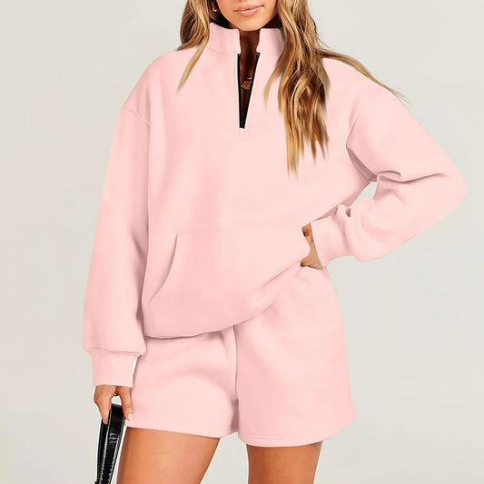 Long Sleeve Zipper Pullover Sweater & Shorts Co-ord Set - Pink