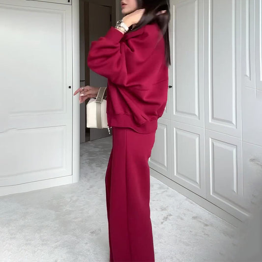 Solid Color Loose Zip Sweater & Casual Trousers Co-ord Set - Claret Red