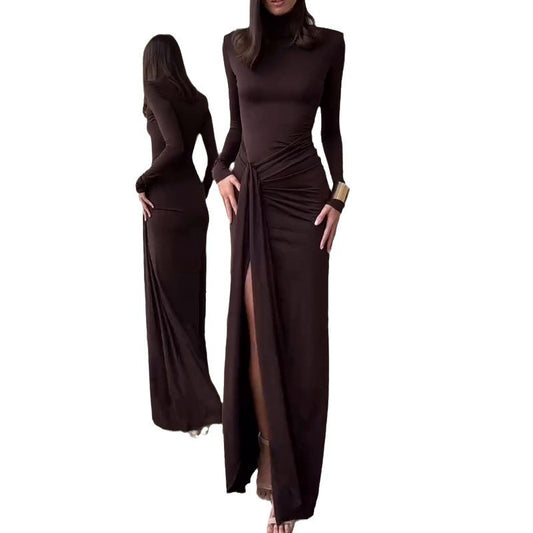 Slim Fit Elegant Long Sheath Dress - Coffee