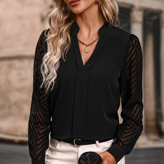 V-neck Lace Hollowed-out Long-sleeved Shirt - Black