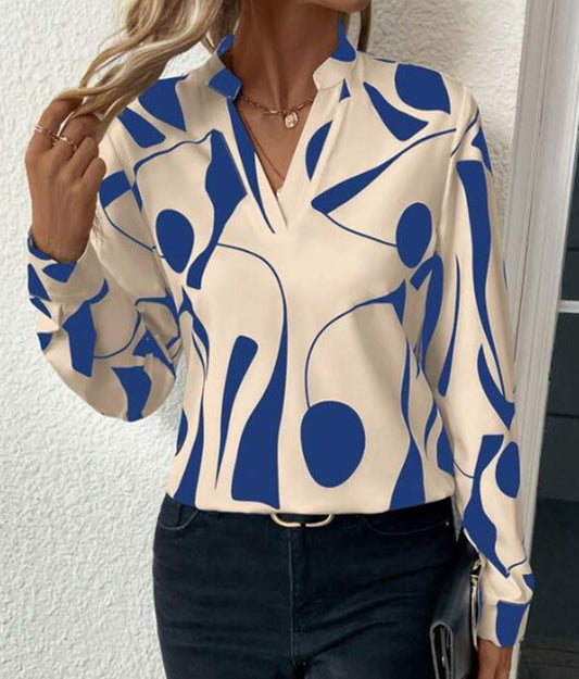 V-neck Long Sleeve Printed Stand Collar Shirt - Khaki