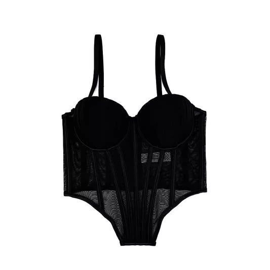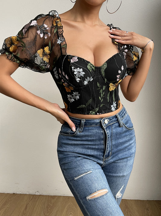 Net Embroidered Flowers Embroidered Puff Sleeve Corset - Black