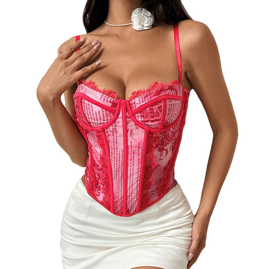 Vintage Flower Print French Lace Up Corset Top - Multicolor