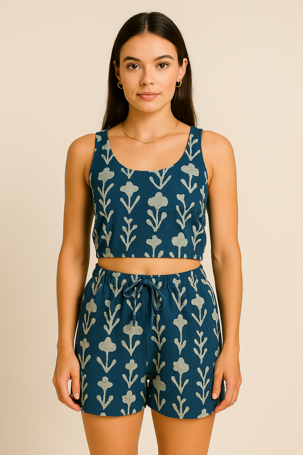 A sleeveless indigo crop top featuring a scoop neckline and all-over botanical handblock print. Tailored for a relaxed fit, perfect for sunny days and easy layering.