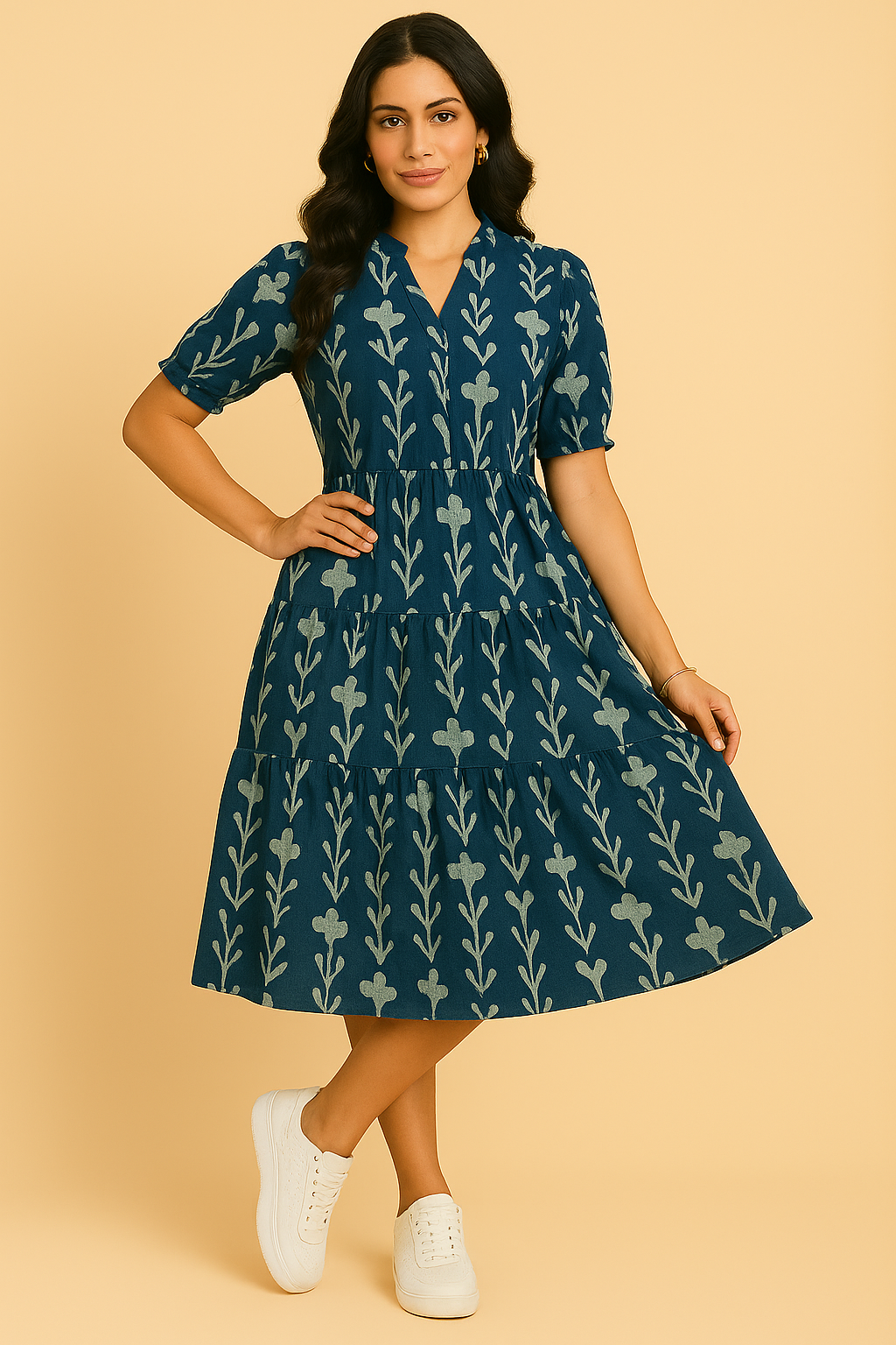 Navy Floral Tiered Midi Dress with Puff Sleeves